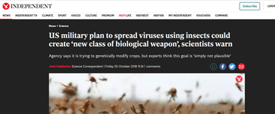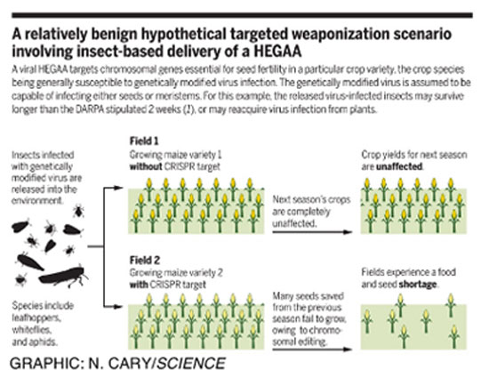 Δεν υπάρχει παρεξήγηση. Οι πέντε συγκεκριμένοι ειδικοί που υπογράφουν το πιο πάνω κείμενο κατηγορούν όσο πιο ανοικτά αλλά και κομψά γίνεται (επιστήμονες γαρ…) την αμερικανική DARPA ότι κάνει έρευνες για βιολογικά όπλα μέσα σε συσκευασία “να ενισχύσουμε την αγροτική μας παραγωγή”. Ειδικά βιολογικά όπλα όχι απευθείας κατά ανθρώπων, αλλά εναντίον βασικών καλλιεργειών, όπου μια επίθεση με “γενετικά πειραγμένα έντομα που κουβαλάνε γενετικά τροποποιημένους ιούς ώστε να προσβάλουν τα φυτά” θα προκαλέσει πείνα και θάνατο…