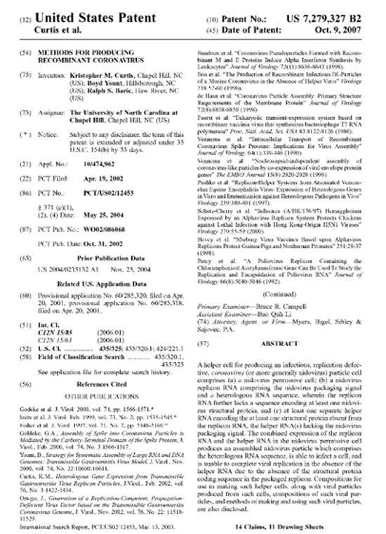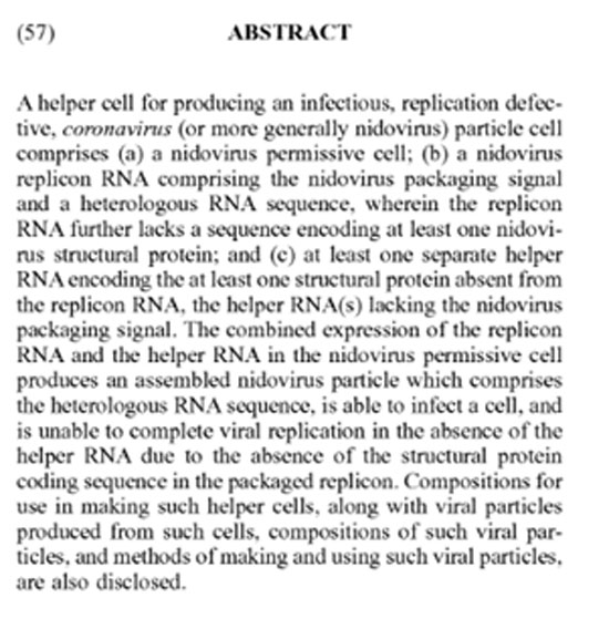 Η δουλειά έγινε, ο γενετικά μεταλλαγμένος κορωνοϊός κατασκευάστηκε με τις συγκεκριμένες προδιαγραφές, και στις 19 Απρίλη του 2002 πατενταρίστηκε με την πατέντα νο 72793276. Υποθέτουμε ότι για τα τεχνολογικά δεδομένα της εποχής η συγκεκριμένη κατασκευή θεωρήθηκε ένα νοσηρό θαύμα. Ήταν ίσως η πρώτη φορά που ένας σχετικά απλός μεταδοτικός μέσω αέρα ιός, ζωϊκής προέλευσης που δεν είχε μεταδοθεί ποτέ σε ανθρώπους, οπλοποιήθηκε ώστε να προκαλεί σοβαρή πνευμονοπάθεια στο είδος μας…
