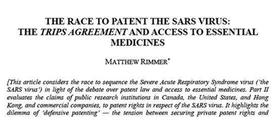 Το πατεντάρισμα του SARS προκάλεσε έναν κάποιο “προβληματισμό” (σε εισαγωγικά…) διεθνώς. Πιθανότατα ήταν ένα σημείο στροφής σε μια σειρά ζητήματα γύρω απ’ την νομική πλαισίωση της γενετικής μηχανικής. Ο αυστραλός πανεπιστημιακός Matthew Rimmer, σε ένα εκτενές άρθρο του με τίτλο The Race to Patent the Sars Virus: The Trips agreement and access to essential medicines10 έδωσε με εντελώς μετριοπαθή και συμβιβαστικό τόνο ένα σύντομο πανόραμα:
