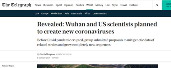 Η αγγλική καθεστωτική The Telegraph, μόλις στις 5 Οκτώβρη του 2021, μ’ ένα δημοσίευμα δυσνόητο (έως “κρυπτογραφημένο) αν δεν έχει κάποιος υπόψη του όσα γράψαμε πιο πάνω (και ακόμα περισσότερα), κάτω απ’ τον τίτλο Αποκάλυψη: Επιστήμονες απ’ την Wuhan και τις ΗΠΑ σχεδίαζαν να δημιουργήσουν νέους κορωνοϊούς (Revealed: Wuhan and US scientists planned to create new coronoviruses) έγραφε τα εξής (ο τονισμός δικός μας):