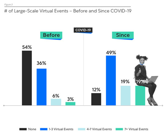 Πίνακας από μια έρευνα μέτρησης των ποσοστών συμμετοχής σε εικονικά events, που δείχνει τα ποσοστά πριν και μετά την covid-19 περίοδο. Ολόκληρη η έρευνα στο https://corp.kaltura.com/wp-content/uploads/2021/11/the-state-of-virtual-events-2022-kaltura.pdf