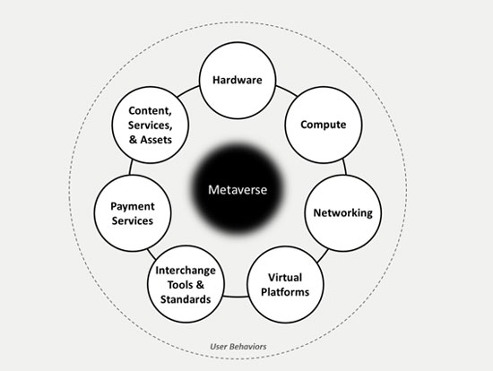Ο ορισμός της “εικονικής πλατφόρμας” είναι ο εξής: “Η ανάπτυξη και λειτουργία ψηφιακών και συχνά τρισδιάστατων προσομοιώσεων, περιβαλλόντων και κόσμων όπου οι χρήστες και οι επιχειρήσεις μπορούν να εξερευνήσουν, να δημιουργήσουν, να κοινωνικοποιηθούν, να συμμετάσχουν σε μια μεγάλη ποικιλία εμπειριών και οικονομικών δραστηριοτήτων. Αυτές οι επιχειρήσεις διαφοροποιούνται από τις παραδοσιακές διαδικτυακές εμπειρίες και τα βιντεοπαιχνίδια, λόγω της ύπαρξης ενός μεγάλου οικοσυστήματος προγραμματιστών και δημιουργών περιεχομένου που παράγουν το μεγαλύτερο μέρος του περιεχομένου ή/και συνοψίζουν την πλειονότητα των εσόδων που προκύπτουν από την πλατφόρμα”.