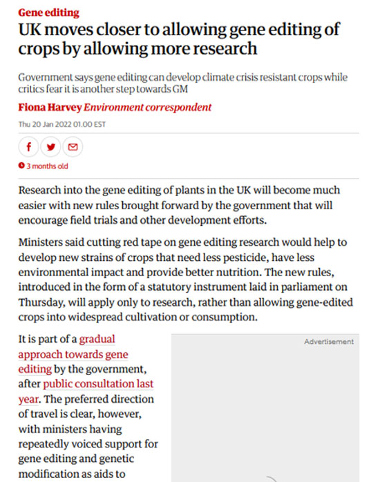 Έχει ωστόσο το πολιτικό και όχι μόνο ενδιαφέρον το γεγονός ότι ΠΡΙΝ τον πόλεμο στην ουκρανία, το επιχείρημα υπέρ του gene editing ήταν … η “κλιματική κρίση”! Αλλά ο πόλεμος στην ουκρανία και η “προοπτική πείνας” (;;;) μπορούν να χρησιμοποιηθούν πολύ πιο τρομοκρατικά, πολύ πιο πιεστικά σε βάρος των πληθυσμών. Αυτή η αλλαγή στην βιομηχανική παραγωγή φόβων και απειλών (με το κατάλληλο όφελος για τ’ αφεντικά) είναι μια ακόμα απόδειξη, αν χρειαζόταν κάποια, για την βίαιη εξαπάτηση.