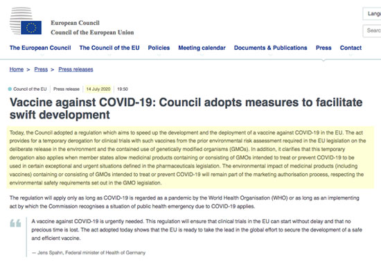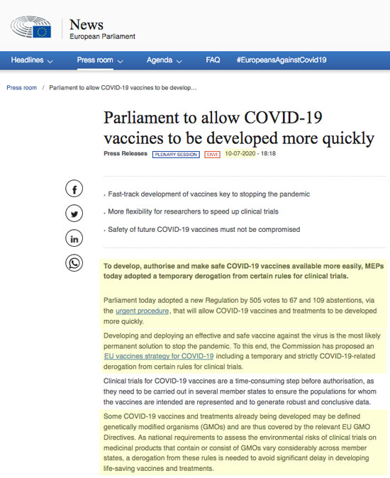 Φυσικά αυτή η απόφαση δεν φρενάρει την επέλαση της γενετικής χειραγώγησης των πάντων! Η “επιτυχία” των mRNA πλατφορμών στην ευρώπη και όχι μόνο έγινε εφικτή επειδή με πανηγυρικό τρόπο στις 10 Ιούλη 2020 το ευρωκοινοβούλιο με ψήφους 505 υπέρ, 67 κατά (και 109 αποχές), αποφάσισε να “παγώσει” (δηλαδή να ακυρώσει) την ευρωπαϊκή νομοθεσία του 2001 κατά των GMOs έτσι ώστε να “απελευθερωθούν” οι mRNA πλατφόρμες για χρήση σε βάρος ανθρώπων· και τέσσερεις ημέρες μετά, στις 14 Ιούλη 2020 το “ευρωπαϊκό συμβούλιο”, δηλαδή οι κεντρικές πολιτικές βιτρίνες των ευρωπαϊκών κρατών / μελών, επικύρωσαν ομόφωνα το “πάγωμα” / ακύρωση!2