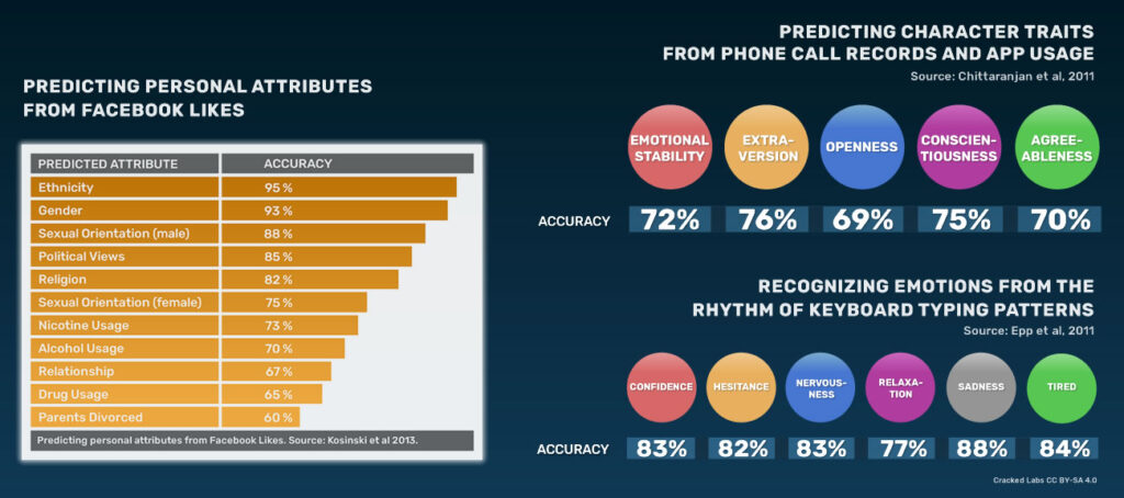 Επιστημονικές μελέτες δείχνουν ότι πολλές πτυχές της προσωπικότητας μπορούν να συναχθούν από τα δεδομένα αναζητήσεων στο διαδίκτυο, τα ιστορικά περιήγησης, τις συνήθειες στις προβολές βίντεο, τις δραστηριότητες στα μέσα κοινωνικής δικτύωσης ή τις αγορές. Για παράδειγμα, ευαίσθητα προσωπικά χαρακτηριστικά όπως η εθνικότητα, οι θρησκευτικές και πολιτικές απόψεις, η κατάσταση σχέσης, ο σεξουαλικός προσανατολισμός και η χρήση αλκοόλ, τσιγάρων και ναρκωτικών μπορούν να συναχθούν με ακρίβεια από τα likes κάποιου στο Facebook. Η ανάλυση των προφίλ των κοινωνικών δικτύων μπορεί επίσης να προβλέψει χαρακτηριστικά της προσωπικότητας όπως την συναισθηματική σταθερότητα, την ικανοποίηση από τη ζωή, την παρορμητικότητα, την κατάθλιψη κα.
