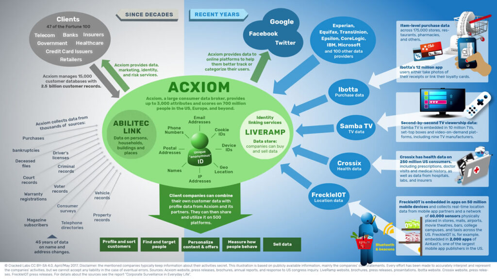 Στον πυρήνα της, η διαδικτυακή διαφήμιση αποτελείται από ένα οικοσύστημα χιλιάδων εταιρειών που επικεντρώνονται στη διαρκή παρακολούθηση και δημιουργία προφίλ δισ. ανθρώπων. Κάθε φορά που μια διαφήμιση εμφανίζεται σε έναν ιστότοπο ή σε μια εφαρμογή για κινητά, το ψηφιακό προφίλ του χρήστη «πωλείται» στον πλειοδότη σε χιλιοστά του δευτερολέπτου πιο πριν. Σε αντίθεση με αυτές τις νέες πρακτικές, οι εταιρείες αναφοράς πιστώσεων και οι μεσίτες δεδομένων καταναλωτών έχουν ήδη περάσει δεκαετίες στον τομέα των προσωπικών δεδομένων. Τα τελευταία χρόνια, άρχισαν να συνδυάζουν τις εκτενείς πληροφορίες που έχουν για τη ζωή των ανθρώπων «εκτός σύνδεσης» με τις βάσεις δεδομένων χρηστών και πελατών που λειτουργούν από μεγάλες πλατφόρμες, εταιρείες διαδικτυακής διαφήμισης και μυριάδες άλλες επιχειρήσεις σε πολλούς κλάδους.
