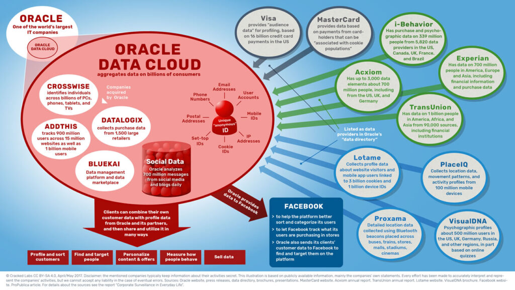 Με την εξαγορά πολλών εταιρειών δεδομένων όπως η Datalogix, η BlueKai, η AddThis και η CrossWise, η Oracle, ένας από τους μεγαλύτερους προμηθευτές επιχειρηματικού λογισμικού και βάσεων δεδομένων στον κόσμο, έγινε πρόσφατα και ένας από τους μεγαλύτερους διαμεσολαβητές καταναλωτικών δεδομένων. Στις βάσεις δεδομένων της, η Oracle συγκεντρώνει 3 δισ. προφίλ χρηστών από 15 εκ. διαφορετικούς ιστότοπους, δεδομένα από 1 δισ. χρήστες κινητών τηλεφώνων, δισ. αγορές από αλυσίδες σουπερ μάρκετ και 1.500 μεγάλους λιανοπωλητές, καθώς και 700 εκ. μηνύματα από δίκτυα κοινωνικών μέσων, ιστολόγια και κριτικές καταναλωτών ανά ημέρα.