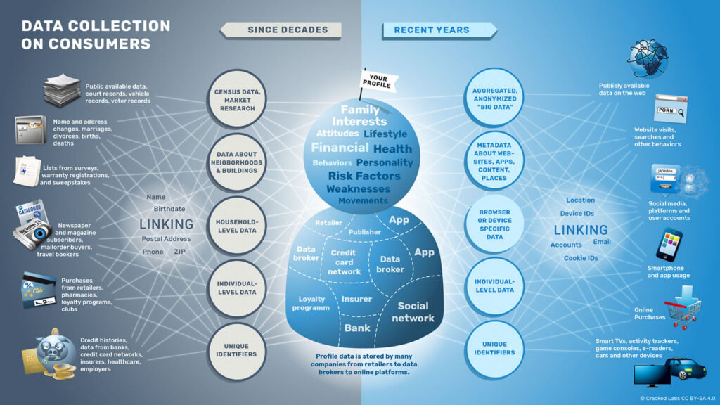Ένα ευρύ φάσμα εταιρειών συλλέγει πληροφορίες για ανθρώπους εδώ και δεκαετίες. Πριν από το διαδίκτυο, τόσο τα γραφεία πιστοληπτικής αξιολόγησης όσο και τα πρακτορεία μάρκετινγκ αποτελούσαν τα κύρια σημεία ενοποίησης μεταξύ δεδομένων που ρέουν από διαφορετικές πηγές. Ένα πρώτο μεγάλο βήμα στη συστηματική επιτήρηση των καταναλωτών έγινε τη δεκαετία του 1990 μέσω των βάσεων δεδομένων για μάρκετινγκ, προγράμματα επιβράβευσης και αναφορών πιστοληπτικής αξιολόγησης. Μετά την άνοδο του διαδικτύου και της διαδικτυακής διαφήμισης στις αρχές της δεκαετίας του 2000 και την άνοδο των κοινωνικών δικτύων και των smartphone στα τέλη της δεκαετίας του 2000, βλέπουμε τώρα την παραδοσιακή βιομηχανία δεδομένων καταναλωτών να ενσωματώνεται στο νέο οικοσύστημα ψηφιακής παρακολούθησης και δημιουργίας προφίλ.