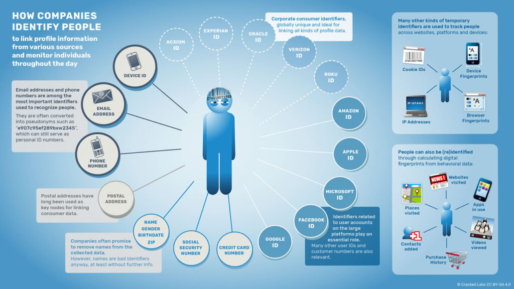 Λόγω της ασάφειάς του, το νομικό όνομα ενός ατόμου ήταν πάντα ένα κακό αναγνωριστικό για τη συλλογή δεδομένων. Η ταχυδρομική διεύθυνση, αντίθετα, ήταν από καιρό, και εξακολουθεί να είναι, ένα βασικό χαρακτηριστικό που επιτρέπει τον συνδυασμό και τη σύνδεση των δεδομένων σχετικά με τους καταναλωτές και τις οικογένειές τους από διαφορετικές πηγές. Στον ψηφιακό κόσμο, τα πιο σχετικά αναγνωριστικά που χρησιμοποιούνται για τη σύνδεση προφίλ και δεδομένων συμπεριφοράς σε διαφορετικές βάσεις δεδομένων, πλατφόρμες και συσκευές είναι οι διευθύνσεις email, οι αριθμοί τηλεφώνου και οι μοναδικοί κωδικοί που αναφέρονται σε smartphone ή άλλες συσκευές.