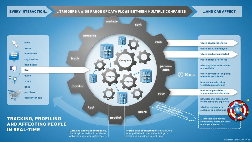 Η διάχυτη μηχανική της παρακολούθησης πραγματικού χρόνου που έχει αναπτυχθεί για τη διαδικτυακή διαφήμιση επεκτείνεται με ταχείς ρυθμούς και σε άλλους τομείς, από την τιμολόγηση προϊόντων έως την πολιτική επικοινωνία, τη πιστοληπτική αξιολόγηση και την εκτίμηση ρίσκου. Μεγάλες διαδικτυακές πλατφόρμες, εταιρείες ψηφιακής διαφήμισης, μεσίτες δεδομένων και επιχειρήσεις σε πολλούς τομείς μπορούν πλέον να αναγνωρίζουν, να ταξινομούν, να κατηγοριοποιούν, να αξιολογούν, να βαθμολογούν και να κατατάσσουν τους καταναλωτές από διαφορετικές πλατφόρμες και συσκευές. Κάθε κλικ σε έναν ιστότοπο και κάθε άγγιγμα σε ένα smartphone μπορεί να ενεργοποιήσει μια μεγάλη ποικιλία κρυφών μηχανισμών κοινόχρηστων δεδομένων που μοιράζονται διάφορες εταιρείες και ως εκ τούτου να επηρεάσουν άμεσα τις διαθέσιμες επιλογές ενός ατόμου. Η ψηφιακή παρακολούθηση και η δημιουργία προφίλ (profiling), σε συνδυασμό με την εξατομίκευση, δεν χρησιμοποιούνται μόνο για την παρακολούθηση, αλλά και για να επηρεάσουν τη συμπεριφορά των ανθρώπων.