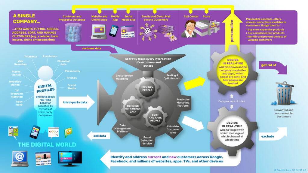 Οι εταιρείες έχουν αναπτύξει τεχνολογίες για να υπολογίζουν και να αξιολογούν συνεχώς την πιθανή μακροπρόθεσμη αξία κάποιου, με βάση πληροφορίες σχετικά με το ιστορικό περιήγησης, αναζήτησης και τοποθεσίας ενός ατόμου, καθώς και τη χρήση εφαρμογών, τις αγορές προϊόντων ή τους φίλους σε ένα κοινωνικό δίκτυο. Κάθε κλικ, άγγιγμα σε οθόνη αφής, «like», ανάρτηση ή αγορά μπορεί να επηρεάσει αυτόματα τον τρόπο με τον οποίο αντιμετωπίζεται κάποιος ως πελάτης, πόσο καιρό κάποιος πρέπει να περιμένει όταν καλεί μια τηλεφωνική γραμμή επικοινωνίας ή εάν κάποιος αποκλείεται από τις προσπάθειες ή τις υπηρεσίες μάρκετινγκ.