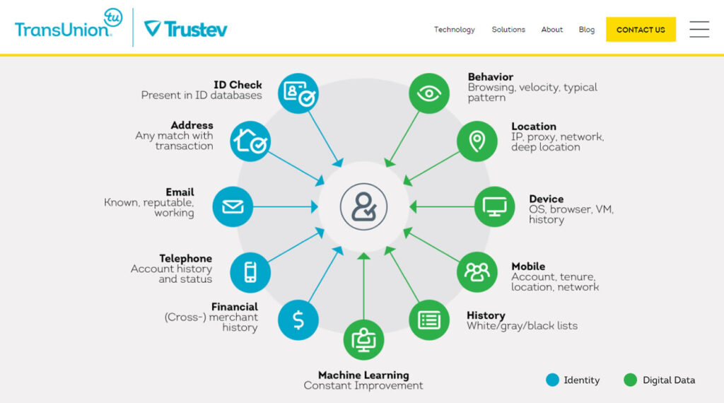 Η Trustev, μια διαδικτυακή εταιρεία ανίχνευσης απάτης με έδρα την Ιρλανδία, η οποία εξαγοράστηκε από την εταιρεία πιστοληπτικής αξιολόγησης TransUnion το 2015, αξιολογεί τις διαδικτυακές συναλλαγές για πελάτες σε χρηματοοικονομικές υπηρεσίες, την κυβέρνηση, την υγειονομική περίθαλψη και την ασφάλιση, με βάση την ανάλυση των ψηφιακών συμπεριφορών, των ταυτοτήτων και των συσκευών όπως τα τηλέφωνα, τα tablet, τους φορητούς υπολογιστές, τις κονσόλες παιχνιδιών, τις τηλεοράσεις, ακόμη και τα ψυγεία. Η εταιρεία προσφέρει στους πελάτες τη δυνατότητα να αναλύουν τον τρόπο με τον οποίο οι επισκέπτες κάνουν κλικ και αλληλεπιδρούν με τους ιστοτόπους και τις εφαρμογές και χρησιμοποιεί δεδομένα από ένα ευρύ φάσμα για την αξιολόγηση των χρηστών, όπως τους αριθμούς τηλεφώνου, τα email και τις ταχυδρομικές διευθύνσεις, τα «δακτυλικά αποτυπώματα» του προγράμματος περιήγησης και της συσκευής, τους πιστωτικούς ελέγχους, τα ιστορικά συναλλαγών, τις διευθύνσεις IP, τα στοιχεία κινητής τηλεφωνίας και τις τοποθεσίες. Η Trustev προσφέρει επίσης μια τεχνολογία δημιουργίας του «κοινωνικού δακτυλικού αποτυπώματος» ενός ατόμου, που αναλύει το περιεχόμενο των μέσων κοινωνικής δικτύωσης, συμπεριλαμβανομένης της ανάλυσης της λίστας των φίλων και της αναγνώρισης μοτίβων συμπεριφοράς. Η TransUnion έχει ενσωματώσει την τεχνολογία Trustev στις δικές της λύσεις ταυτοποίησης και πρόληψης της απάτης.