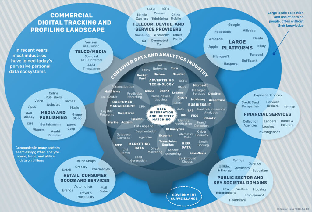 Οι διαδικτυακές πλατφόρμες, οι πάροχοι τεχνολογίας διαφήμισης, οι μεσίτες δεδομένων και οι επιχειρήσεις σε όλους τους κλάδους μπορούν πλέον να παρακολουθούν, να αναγνωρίζουν και να αναλύουν άτομα σε πολλές καταστάσεις. Μπορούν να μάθουν για το τί ενδιαφέρονται οι άνθρωποι, τί έκαναν σήμερα, τί είναι πιθανό να κάνουν αύριο και πόσο μπορεί να αξίζουν ως πελάτες.
