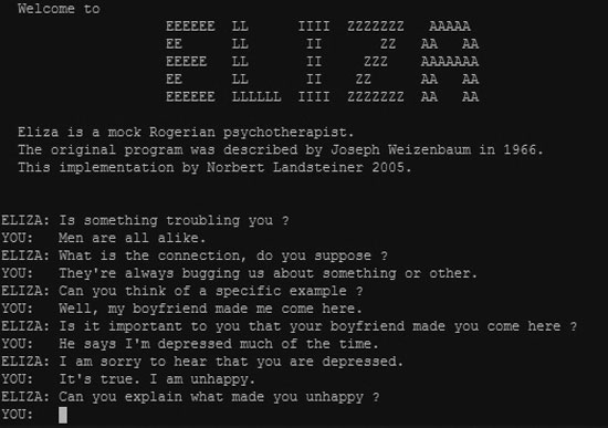 Αυτός ο μικρός διάλογος φαίνεται φυσιολογικός, μεταξύ δύο ανθρώπων· εύλογα ο ένας (ο B) δείχνει να είναι κάτι σαν ψυχολόγος. Αλλά δεν είναι. Ο Β είναι ένα από τα πρώτα ηλεκτρονικά chatbot, “εφαρμογές διαλόγου με μηχανή”… από το μακρινό 1966. Ο προγραμματιστής του MIT που το κατασκεύασε (Joseph Weizenbaum) “προίκισε” το chatbot με λεκτικά data ψυχοθεραπείας. Αυτό σημαίνει ότι κάθε ένας και καθεμιά που “έπιασε κουβέντα” με το chatbot Eliza, σα να λέμε το ανθρώπινο μέρος αυτής της “διάδρασης – μέσω – γραπτού – κειμένου”, ήταν κατά κάποιον τρόπο καταβεβλημένο, πεπεισμένο ότι έχει κάποιο “πρόβλημα” ψυχολογικού είδους. Είτε προς έκπληξη της ομάδας του Weizenbaum είτε όχι προέκυψε ότι οι “πελάτες” της Eliza εκδήλωναν συναισθηματική αντίδραση και απόδοση στη μηχανή ανθρώπινων χαρακτηριστικών. “Δεν είχα σκεφτεί εκ των προτέρων … ότι ακόμα και σύντομη έκθεση σ’ ένα τέτοιο σχετικά απλό υπολογιστικό πρόγραμμα θα προκαλούσε ισχυρή ψευδαισθησιακή σκέψη σε αρκετά φυσιολογικούς ανθρώπους” παρατήρησε αργότερα ο Weizenbaum.