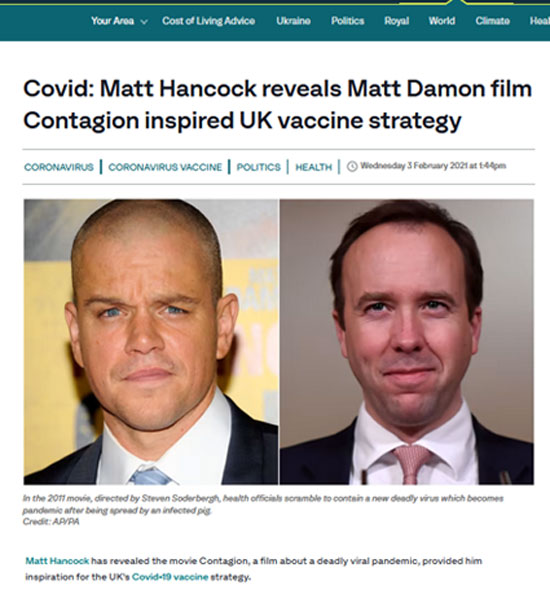 Η κορύφωση του επαίνου στο Contagion ήρθε, τελικά, από εκεί που δεν το περιμενε κανείς: απ’ τον ανεκδιήγητο υπουργό υγείας της κυβέρνησης της αυτού μεγαλειότητας βασίλισσας της αγγλίας (κλπ) Matt Hancock4. Πριν αναγκαστεί να παραιτηθεί, δήλωσε στις αρχές Φλεβάρη του 2021, ότι η ταινία τον ενέπνευσε ως προς τι θα έπρεπε να αποφευχθεί στη διανομή των “εμβολίων”.