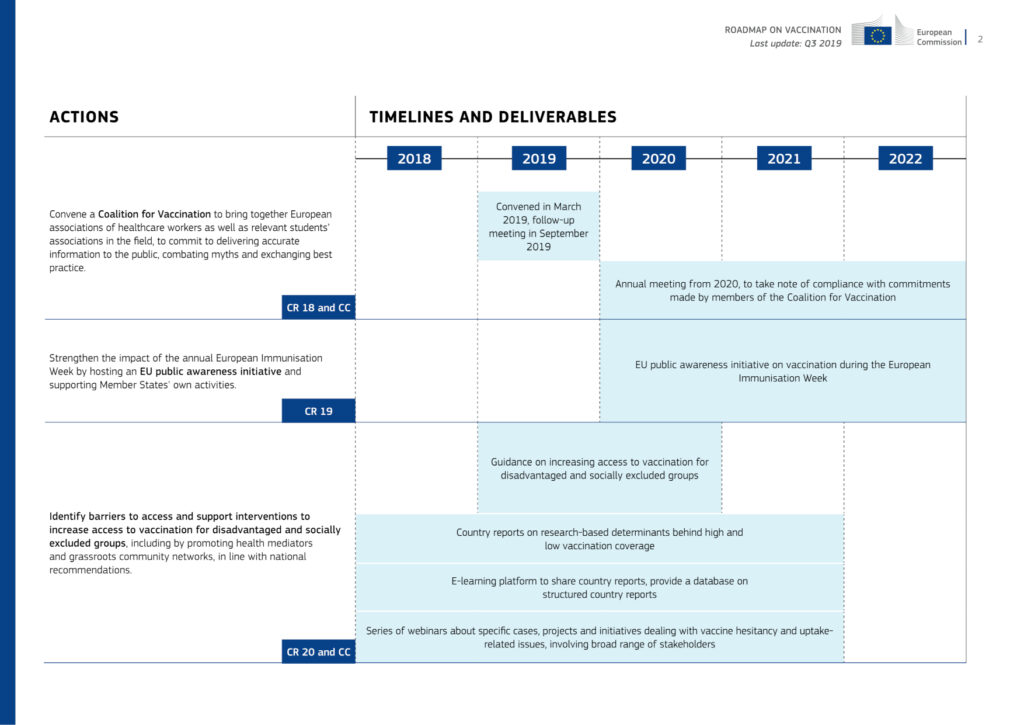 … Η Ε.Ε. διαμόρφωσε έναν «Δρόμο προς τον Εμβολιασμό» συνδεδεμένο με ψηφιακό διαβατήριο υγείας πριν την εμφάνιση του ιού· η τελευταία αναβάθμιση του σχεδίου έγινε το τρίτο τρίμηνο του 2019. Περιέχει λεπτομέρειες για ένα σχέδιο που εκτείνεται απ’ το 2018 ως το 2022 για να «εξεταστεί η βιωσιμότητα της ανάπτυξης ενός ενιαίου διαβατηρίου / κάρτας εμβολιασμού για τους πολίτες της Ε.Ε.» και «να αναπτυχθούν οι οδηγίες της Ε.Ε. για την καθιέρωση ενός γενικού ηλεκτρονικού πληροφορικού συστήματος ανοσοποίησης».