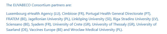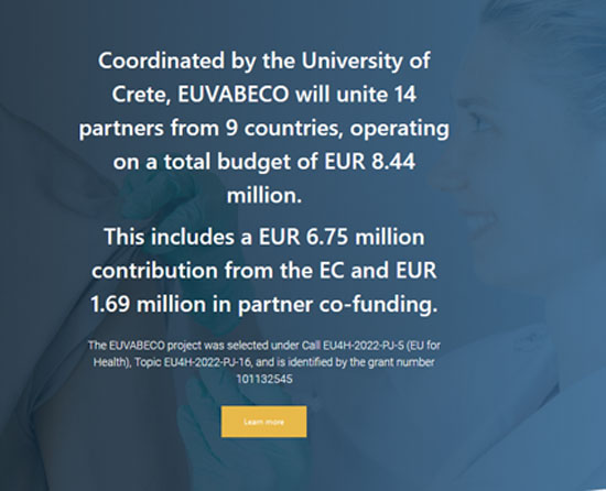 Με χαρά σας ανακοινώνουμε την επερχόμενη έναρξη του EUVABECO (“ευρωπαϊκός εμβολιασμός μετά την covid-19”) την 1η Ιανουαρίου 2024, που έχει στόχο να δημιουργήσει τις συνθήκες για καινοτόμες πρακτικές εμβολιασμού στην Ευρώπη. Το πρόγραμμα θα τρέξει για 30 μήνες και υποστηρίζεται σε μεγάλο βαθμό απ’ την Ευρωπαϊκή Επιτροπή [κωδικός: η γνωστή Ursula…] με χρηματοδότηση απ’ το πρόγραμμα EU4Health. Συντονίζεται απ’ το πανεπιστήμιο της Κρήτης, με ένα κονσόρτσιουμ που φέρνει μαζί δεκαετέσσερεις (14) εταίρους από εννιά (9) χώρες, με συνολικό προϋπολογισμό 8,4 εκατομμύρια ευρώ.
