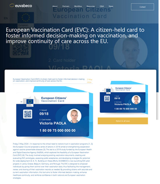 Απαντώντας στην κρίσιμη ανάγκη αποκατάστασης της εμπιστοσύνης στα εμβολιαστικά προγράμματα το ευρωπαϊκό συμβούλιο πρότεινε μια σειρά δράσεις το 2018 με σκοπό την ενίσχυση της συνεργασίας κατά των ασθενειών που αντιμετωπίζονται με εμβόλια. Αυτό οδήγησε το 2019 σε μια μελέτη απ’ την European Health and Digital Executive Agency (HaDEA), που εξερεύνησε την βιωσιμότητα της ευρωπαϊκής κάρτας εμβολιασμού (EVC). Η μελέτη περιελάμβανε την ανάλυση των υπαρχόντων ντοκουμέντων για εμβολιασμούς, την δημιουργία και την αξιολόγηση προτύπων EVC, εκτιμήσεις για την αποδοχή του κοινού, και την ανάπτυξη στρατηγικών για την εν δυνάμει ανάπτυξη σ’ όλη την Ευρώπη. Κτίζοντας πάνω σ’ αυτές τις προσπάθειες το EUVABECO ξεκινάει τώρα πιλοτικά προγράμματα EVC στην Λετονία, στην Ελλάδα, στο Βέλγιο, στην Γερμανία και στην Πορτογαλία. Η EVC έχει σχεδιαστεί για να δυναμώσει τον έλεγχο των ιδιωτών πάνω στα δεδομένα εμβολιασμού τους, οργανώνοντας την διαχείριση, την επιθεώρηση και την μοιρασιά των καταγραφών τους για εμβολιασμούς όπου χρειάζεται. Προσφέροντας στους πολίτες ακρινή και διαρκή πληροφορία για τους εμβολιασμούς, αυτό το εργαλείο σκοπεύει να προάγει τις αποφάσεις που βασίζονται πάνω σε πληροφορίες, να ενισχύει την συνέχεια της ιατρικής φροντίδας, και να ξαναενισχύσει την εμπιστοσύνη τόσο στις εθνικές όσο και στις ευρωπαϊκές στρατηγικές εμβολιασμού.