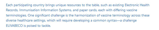 Κάθε συμμετέχουσα χώρα βάζει στο τραπέζι [της τωρινής, «πιλοτικής φάσης»…] ξεχωριστούς πόρους όπως οι υπάρχουσες Ηλεκτρονικές Καταγραφές Υγείας, τα Πληροφορικά Συστήματα Ανοσοποίησης, και χάρτινες κάρτες, ο καθένας [απ’ αυτούς τους πόρους] με διαφορετικές εμβολιαστικές ορολογίες. Μια σημαντική πρόκληση είναι η εναρμόνιση της εμβολιαστικής ορολογίας μεταξύ αυτών των διαφορετικών καταγραφών υγείας, που θα απαιτήσει την δημιουργία ενός κοινού συντακτικού – μια πρόκληση που το EUVABECO είναι έτοιμο να απαντήσει.