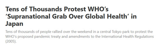 Η ιαπωνική κυβέρνηση βρέθηκε εκτεθειμένη. Προσπαθώντας να αμυνθεί άρχισε να μουρμουρίζει «μας το είπε ο Π.Ο.Υ.» Αυτό δεν την έσωσε∙ αντίθετα έβαλε και το παραμάγαζο των φαρμακομαφιών στο στόχαστρο. Ακόμα περισσότερο που δόθηκε η πρέπουσα σημασία στις προσπάθειες του παραμάγαζου να επιβάλλει «παγκόσμια συνθήκη για τις πανδημίες», αναθέτοντας τους υπαλλήλους των δυτικών φαρμακομαφιών την εξουσία όλων των αποφάσεων για το τι «πρέπει να γίνει» στις επόμενες «πανδημίες» – επ’ απειλή τιμωριών, κυρώσεων, κλπ για τους ανυπάκουους (κράτη και υπηκόους).