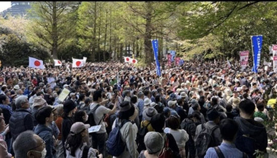 Στα μέσα Απρίλη μια πολύ μεγάλη για τα ιαπωνικά δεδομένα (όπου δεν γίνονται διαδηλώσεις…) συγκέντρωση / διαδήλωση τουλάχιστον 30.000 ατόμων στο Τόκιο είχε ως στόχους: