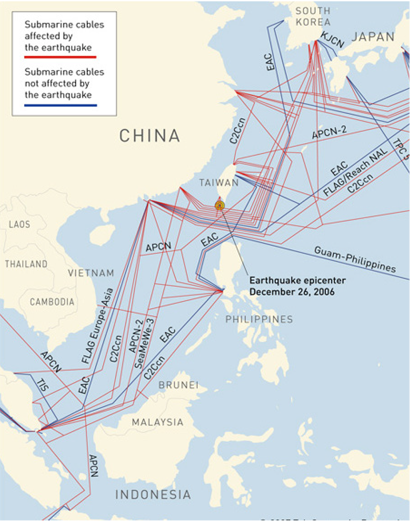 Chokepoints where cables converge because of underwater terrain or other factors are especially vulnerable. One is the Luzon Strait near the Philippines, where all the undersea cables connecting Hong Kong, Taiwan, South Korea and Japan pass. The site’s vulnerability was underscored on December 26, 2006, when an undersea landslide severed six cables, temporarily disrupting Internet traffic throughout the region.